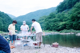 キャンプ場の目の前には、河川公園があり、鬼怒川の雄大な渓流沿いでのバーベキューができます。